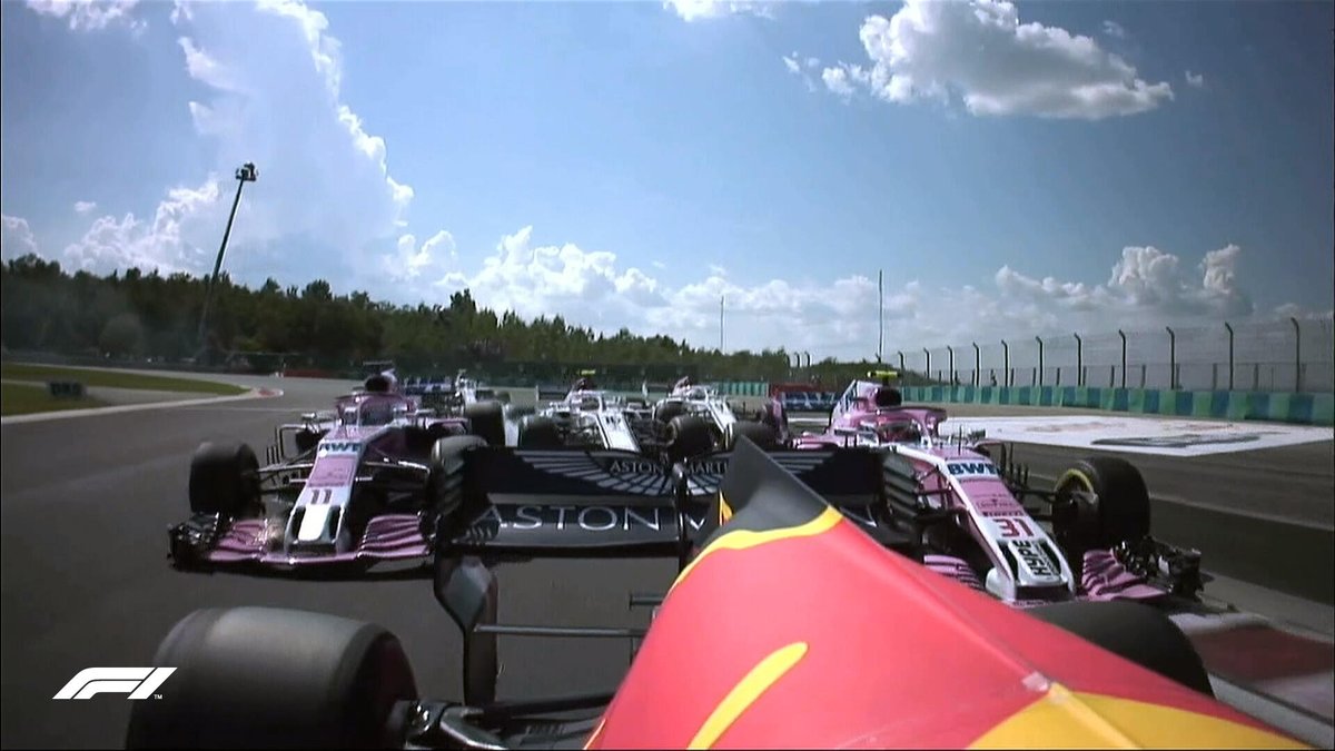 16:14:57 - 1 круг: Хэмилтон, Боттас, Феттель, Райкконен, Ферстаппен, Гасли, Магнуссен, Сайнс, Хартли, Хюлкенберг, Алонсо, Грожан, Вандорн, Окон, Перес, Риккардо, Сироткин, Эрикссон, Стролл, Леклер