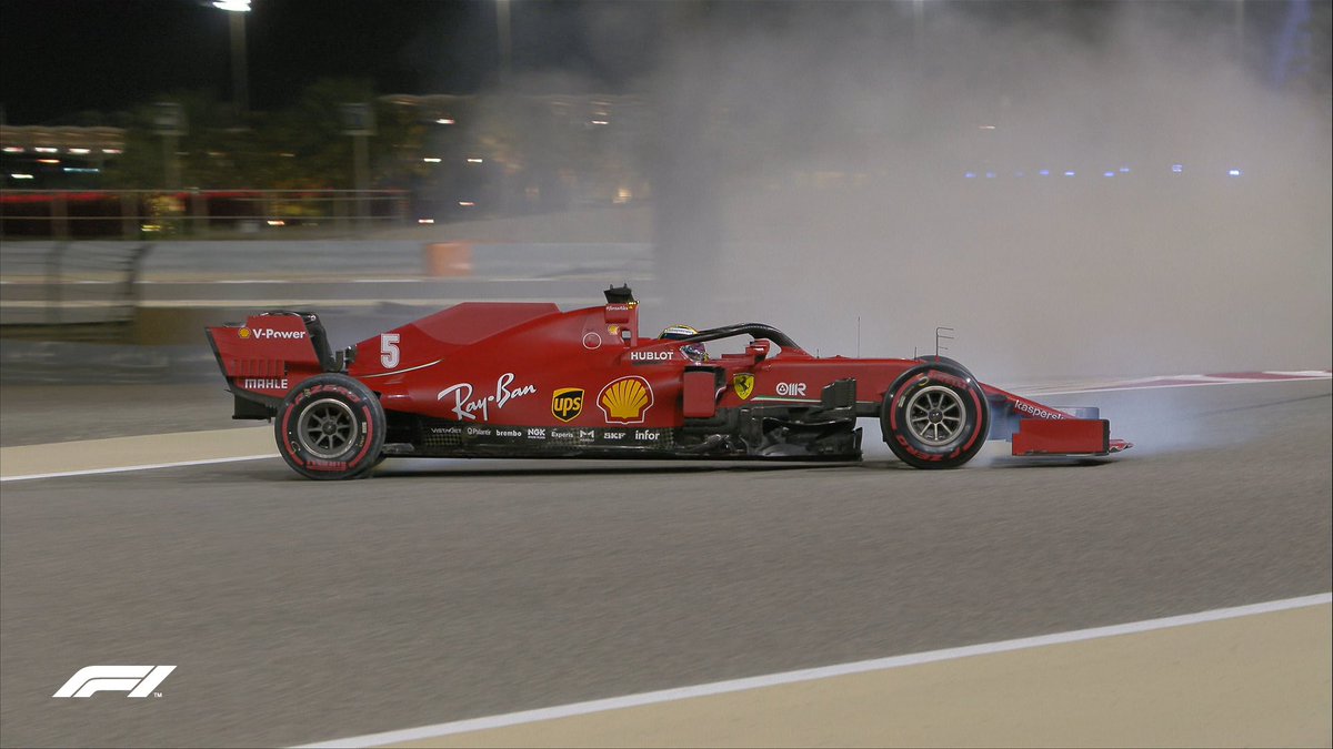 Вторая пятничная практика Гран-При Сахира. Себастьян Феттель потерял контроль над своей Ferrari и едва не вынес Haas Кевина Магнуссена.