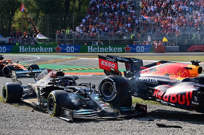 Red Bull RB16B буквально упала на Mercedes Хэмилтона. Это выглядело опасно, но пилоты столкнулись на скорости около 40 километров в час.