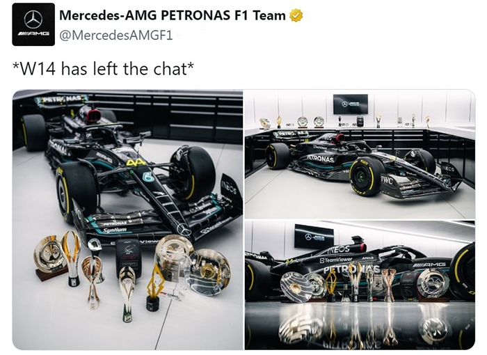 Команда решила провести комическое прощание с W14, опубликовав сообщение: "W14 покинула чат". Этот формат напоминает уведомление в мессенджере, которое появляется, когда кто-то покидает чат. В посте также представлены фотографии болида W14 и его достижения, подчеркивая, что вся история этого сезона уместилась в одну фотографию.