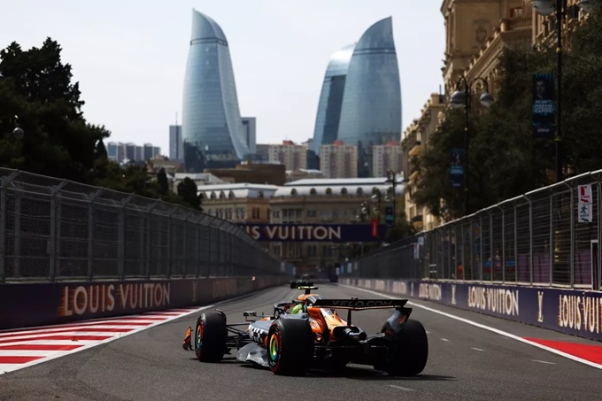 Пилот McLaren Ландо Норрис показал лучший результат в первой практике Гран-При Азербайджана. Вторым стал его напарник Оскар Пиастри, третьим - представитель Ferrari Шарль Леклер.