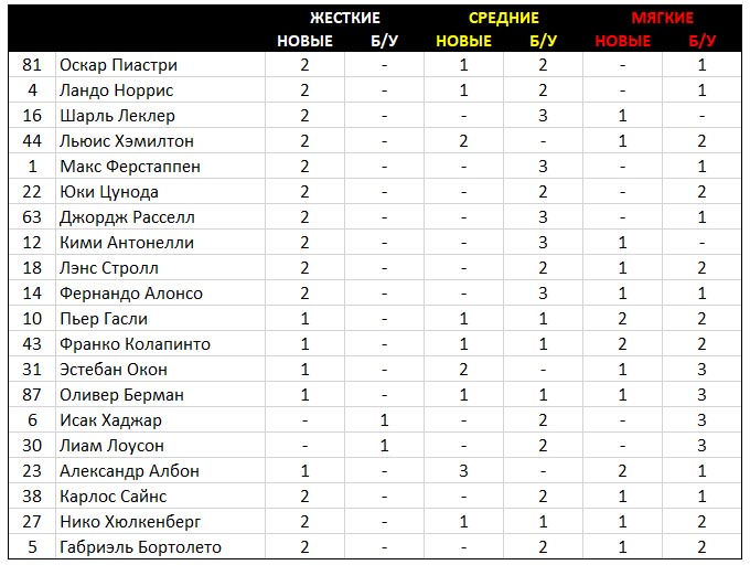 У всех пилотов осталось по одному комплекту свежих жестких шин, у представителей топ-команд даже по два. Новые комплекты средней резины, если смотреть на лидеров, есть только у Оскара Пиастри, Ландо Норриса и Льюиса Хэмилтона.