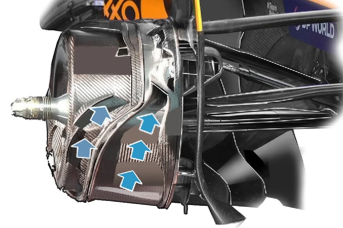 Инновационная тормозная система стала козырем команды McLaren в текущем сезоне. Система биметаллических заслонок, которые меняют свое положение в зависимости от температуры, позволяет менять направление потоков воздуха, охлаждая или нагревая тормозной барабан, а вместе с ним колесо и резину. Быстрый прогрев позволяет добиться немедленной эффективности от резины, а охлаждение - повысить износостойкость. Но со следующего сезона такие системы будут вне закона.
