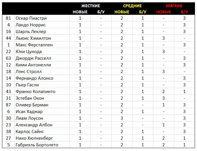 После квалификации абсолютно у всех осталось по одному новому комплекту жесткой резины и по два комплекта средней. Свежих мягких шин у лидеров нет.