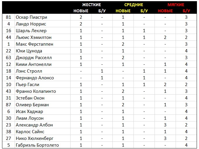 У пилотов McLaren еще один дополнительный комплект жестких шин, у Макса Ферстаппена - средних. Свежих мягких у претендентов на титул нет.