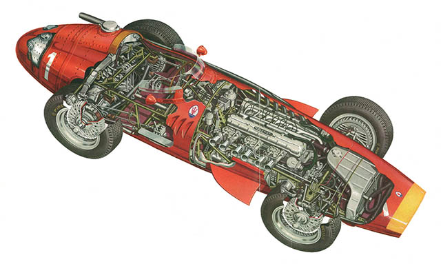 Двигатель был типичным для середины 1950-х: рядная шестерка с двумя клапанами на цилиндр объемом 2493 см3, три сдвоенных карбюратора Weber, два магнето, 12 свечей - первые версии выдавали 240 л.с. при 7200 л.с. Располагался двигатель спереди, при этом был завален вбок на шесть градусов - карданный вал шел левее от центра машины, благодаря чему удалось понизить сиденье пилота.